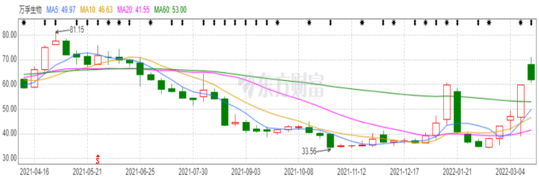 今年1月以来,万孚生物股价经历两次回落,2月其股价还在34.12元/股,后在3月其股价开启一路涨停,曾一度触及71元/股,涨幅达到51.94%,实现翻倍。总体来看,万孚生物的二级市场虽然自2021年4月后频频走低,但如今由于新冠检测试等因素影响,与去年股价最高点81.15元/股已经相差无几。