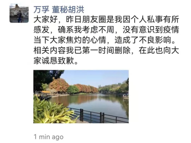 3月13日中午,万孚生物董秘在其微信朋友圈进行致歉称:“昨日朋友圈是我因个人私事有所感发,确系我考虑不周,没有意识到疫情当下大家焦灼的心情,造成了不良影响。相关内容我已第一时间删除,在此也向大家诚恳致歉。”