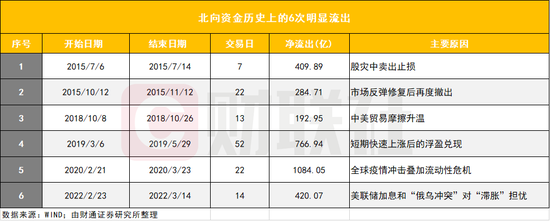 据财通证券统计分析,包括本轮在内,历史上北向资金曾出现6次较为明显的流出: