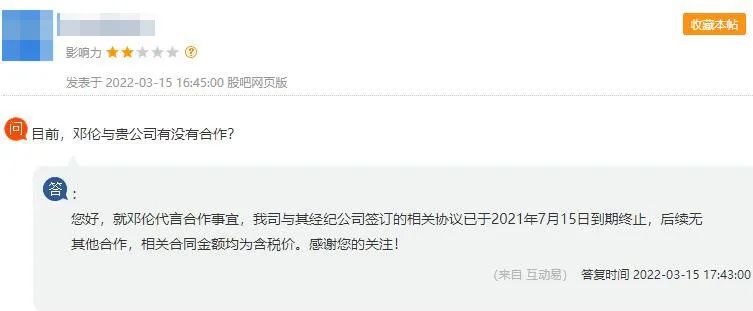 周二17时43分,劲仔食品在股吧回复投资者称,就邓伦代言合作事宜,公司与其经纪公司签订的相关协议已于2021年7月15日到期终止,后续无其他合作,相关合同金额均为含税价。