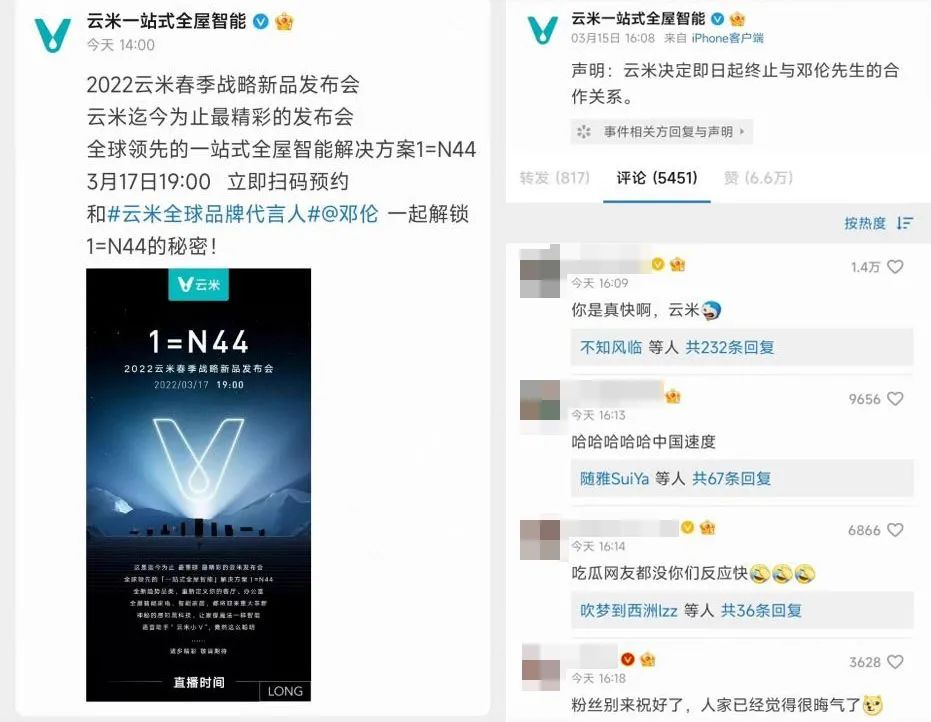云米智能家居在今日14时刚刚发布了邓伦代言品牌的微博。随着邓伦偷逃税的消息一出,云米火速删除相关代言微博并于16时08分发布声明,表示与邓伦终止合作。被网友戏称“两小时代言人”“吃瓜网友都没你反应快”。
