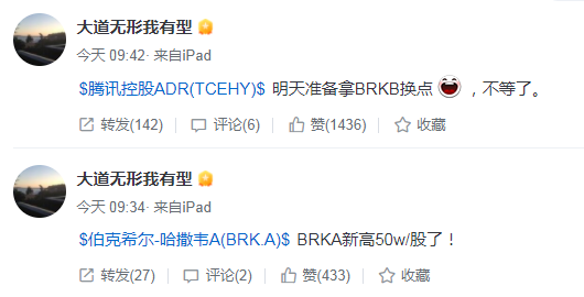 一天之后,或许是腾讯控股下跌的速度超过他的预期,3月15日早间,他表示:“明天准备拿BRKB(伯克希尔哈撒韦)换点,不等了。”