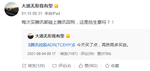 到了2021年8月,段永平再次表示买了点腾讯,要是再跌就再多买些。甚至在今年1月时,他还认为腾讯做回购是在跟他“抢生意”。