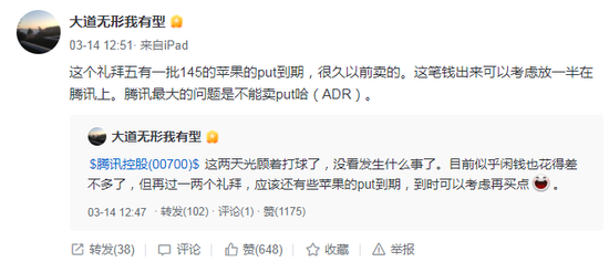 3月14日,段永平表示:“这个礼拜五有一批145的苹果的put(全称Put Option,意指看跌期权)到期,很久以前卖的。这笔钱出来可以考虑放一半在腾讯上。”