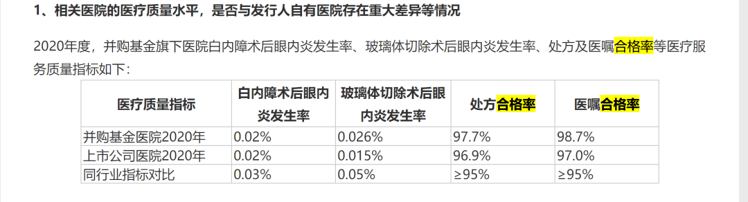 爱尔眼科此次也披露了授权医院(即并购基金医院)与自营医院的手术合格率等各项指标情况,其数据显示在眼科手术的相关指标方面授权医院与自营医院基本保持一致,但是授权医院的玻璃体切除术后眼内炎发生率则略高于爱尔眼科的自营医院。