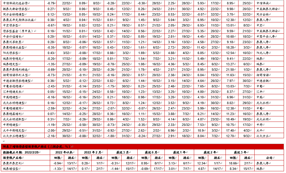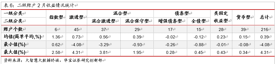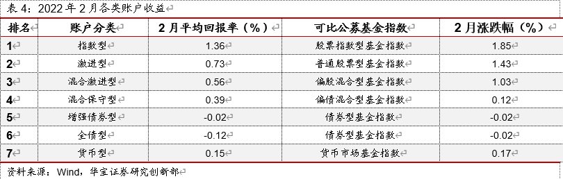 2月各类账户回报率排名见下表。