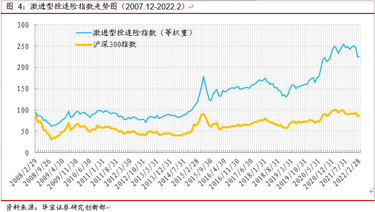 我们将激进型投连险月度平均收益率做等权重加权制作出激进型投连险指数,并将其与沪深300指数做对比,2月份权益市场有所回调,全月激进型投连险指数收益率0.73%,沪深300指数收益率为0.39%。截至2022年2月底,激进型投连险指数收于225.20点,调整后的可比沪深300指数收于85.82点。
