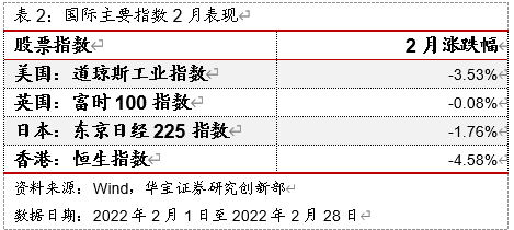 2022年2月国际主要指数表现如下所示: