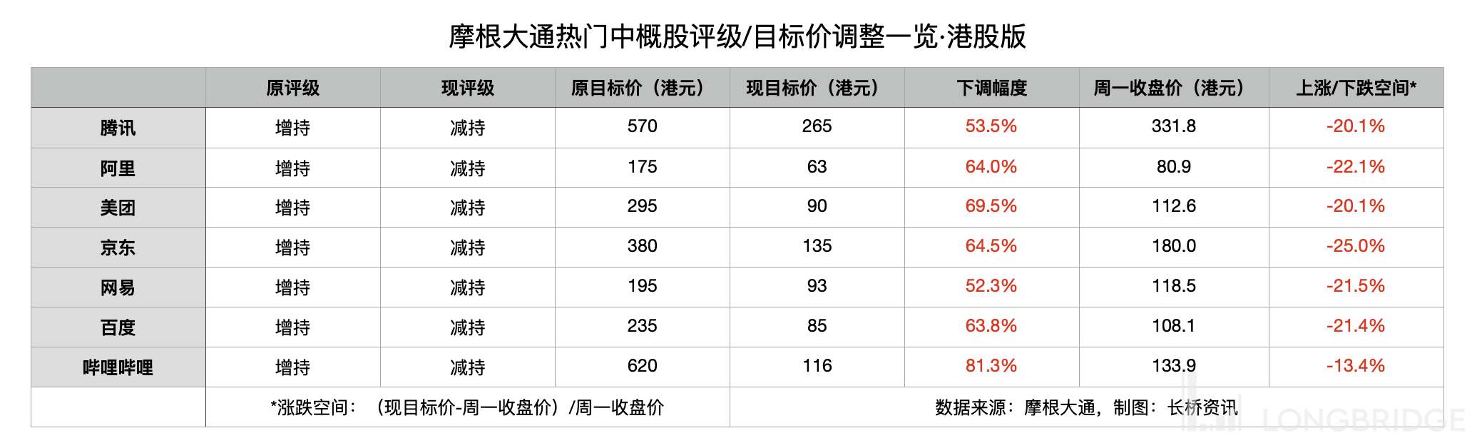 3月14日,摩根大通分析师 Alex Yao 将近 30 家在美、在港上市中概股评级、目标价大幅下调,并称这些股票短期之内 “不可投资”。阿里巴巴砍价64%,腾讯砍价54%,哔哩哔哩砍价81%,美团砍价70%,拼多多砍价80%。