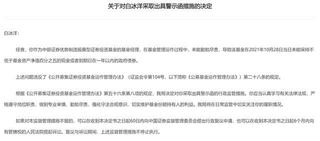 同日,上海证监局对中银证券优势制造股票型证券投资基金的基金经理白冰洋出具了警示函。
