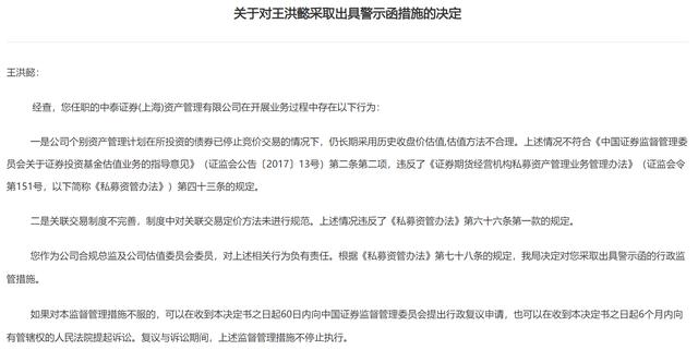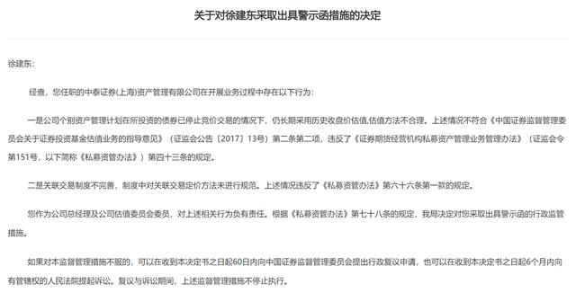 3月17日,上海证监局披露了对中泰证券(上海)资产管理有限公司(简称“中泰资管”)采取责令改正措施的决定,并决定对中泰资管总经理及估值委员会委员徐建东、合规总监及估值委员会委员王洪懿出具警示函。