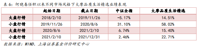 历史情景分析来看,何晓春任职以来历经的四个大小盘风格分别占优的阶段,基金均能灵活适应,且显著跑赢了全市场指数。在下跌市和震荡市中超额收益相对更为显著,季度平均超额收益分别达到6.15%、4.80%。具体而言,基金在上涨市、下跌市及震荡市中的季度平均超额收益分别为2.74%、6.15%、4.80%。(注:将沪深300上涨5%以上的季度定义为“上涨市”,下跌超过5%的季度定义为“下跌市”,涨跌幅在-5%和5%之间的季度定义为震荡市。)