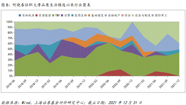 在行业结构上,以TMT为主,设备制造与金融地产为辅。何晓春的投资理念是围绕“人的需求”为中心来进行配置,因此他长期看好科技+大消费,从具体配置上看,大摩品质生活精选在大部分季度持仓中均大幅配置了TMT行业,其次是设备制造与金融地产。