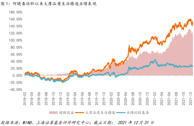 作为何晓春的代表性基金,大摩品质生活精选长期业绩优异、超额收益丰厚,在其任职期间曾获金基金股票型基金五年期奖(2019年)。自其任职以来截至2021年12月31日,基金总回报154.10%,年化回报27.07%,在同类中业绩排名位列82/279,同期业绩比较基准收益率为28.58%,超额收益高达126.92%。