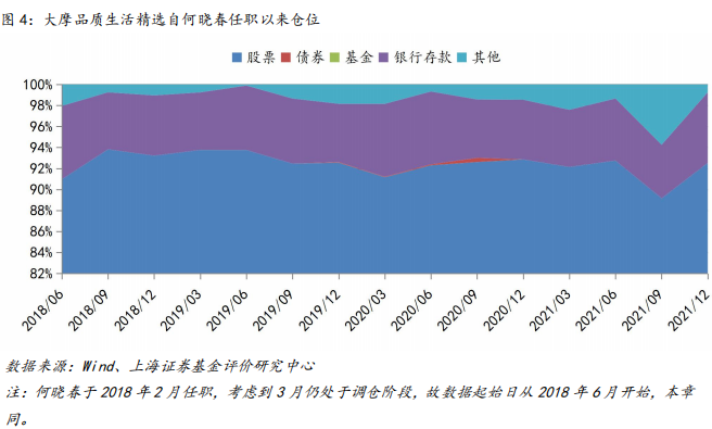 在资产配置上,长期充分投资,风险收益特征鲜明稳定。自何晓春管理大摩品质生活精选以来,基金权益仓位水平长期维持在93%左右,较少进行大幅度仓位变动,保持对市场的充分参与,体现出鲜明且稳定的风险收益特征,这有利于客户对产品清晰认识,从而有利于客户的资产配置。