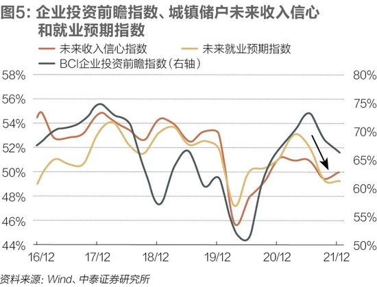 从企业方面来看,无论是反映企业对未来3个月内生产经营活动预期的PMI生产经营活动预期指数,还是测度企业对未来6个月经营情况估计的BCI利润或投资前瞻指数,均自2021年下半年以来明显回落,显示出企业经营的信心不足。