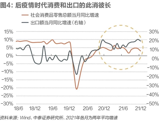 另一方面,在我国“清零化”的疫情防控策略下,海外疫情蔓延使得国内本土疫情屡屡抬头,消费恢复持续受到压制。但居民消费意愿并没有因为疫情带来永久性损失,同时下游如汽车、食品和医药等部分消费品制造业存在较大补库存空间。因此如果出口端因全球疫情缓和而增速放缓,消费端存在回升潜力,将会支撑经济增速保持稳定。所以我们认为2022年出口和消费两者互为牵制,整体不会有太大的起伏(见图4)。