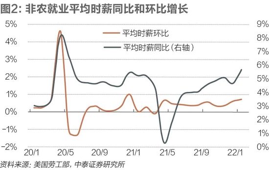 更为关键的是,美国不断提高的工资增速也成为了通胀上行的推手。疫后美国劳动力短缺现象严重,空缺职位率上升至有记录以来的最高水平,劳动力市场供不应求推动工资的上涨,美国的工资调整幅度处于历史高位。1月非农就业平均时薪同比大幅回升,由去年12月的5%升至5.7%,创2020年5月以来新高,环比增速同步走高,“工资-物价”螺旋在美国已经初步形成,特别是低收入者要求更高的薪资增速。工资的抬头将带动通胀上行,预示着美国通胀仍面临着较大的压力,通胀或将继续维持高位(见图2)。