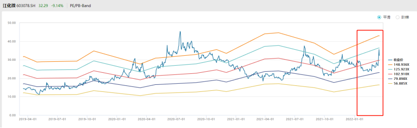 根据PE/PB-Band数据显示,江化微当前估值处于历史相对高位。