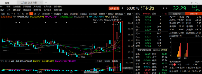 3月14日晚间,江化微发布2021年年报,实现归母净利润5650.77万元,其中第四季度实现归母净利润0.29亿元,同比增长84.7%,环比增长128.96%。亮眼业绩发布后,江化微连续两个交易日放量涨停,昨日又受到地震的消息面扰动再度涨停。