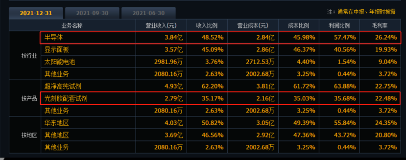 江化微3月18日龙虎榜公开资料显示,江化微是国内湿电子化学品领军企业。按行业来分,半导体业务占据营收比例近五成。按产品来分,光刻胶配套试剂占营收比例为35.17%。