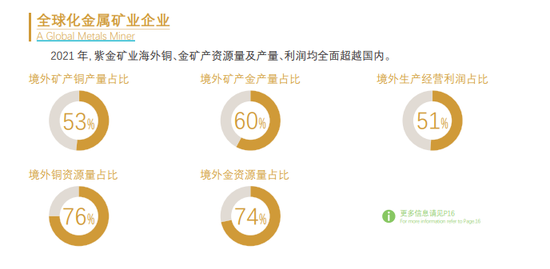 作为紫金矿业重要营收来源和利润贡献点,2021年,公司海外铜、黄金矿产资源量、储量、产量及利润贡献均超越国内。其中海外资源量铜占比76%、金占比74%,海外产量铜占比53%、金占比60%,境外生产经营利润贡献达51%。