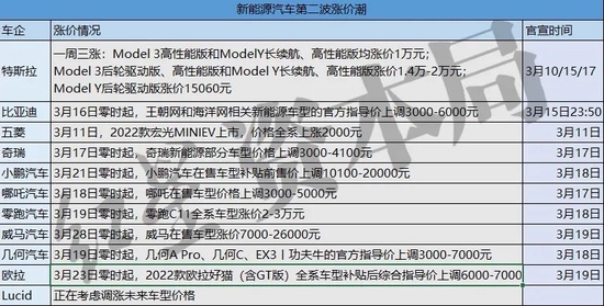 据红星资本局统计,3月15日至3月20日,已有9家新能源车企传出“涨声”,上调幅度从3000元至3万元不等。总体来看,电池、芯片、零部件供应紧张仍是主要涨价理由。