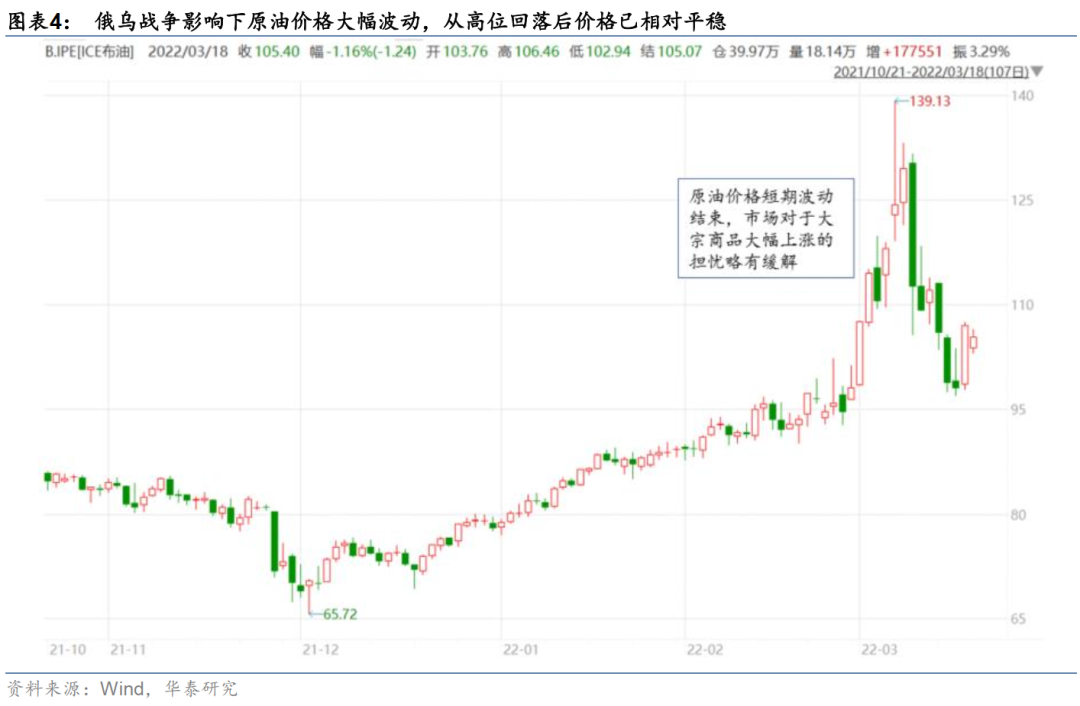 1. 首先,俄乌战争对大宗商品的冲击正逐渐降低,上周观点周报《原油交易处于高风险状态》(2020-03-13)中,我们也提示大宗商品价格形态风险较大,短期已经出现较大的泡沫。俄乌战争未来的走向我们无法预测,但是战争对于市场的影响正逐渐减弱。