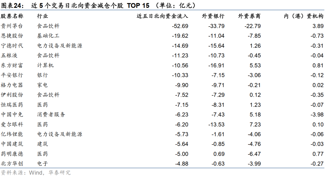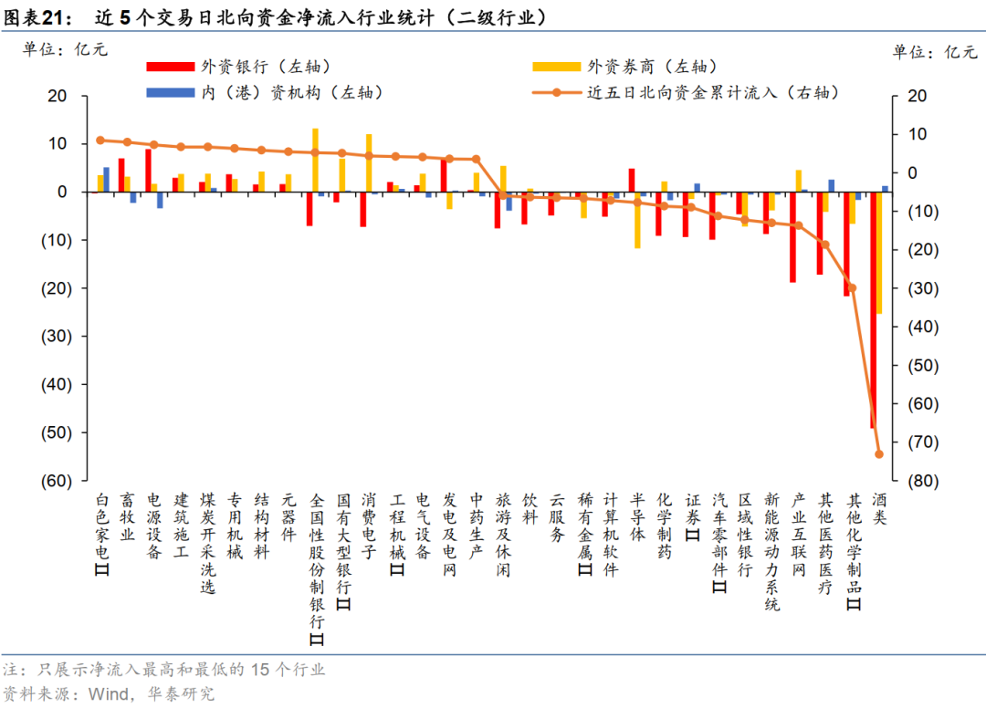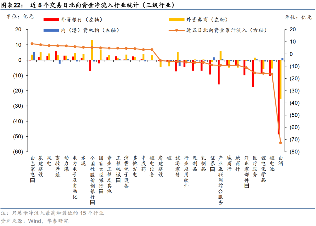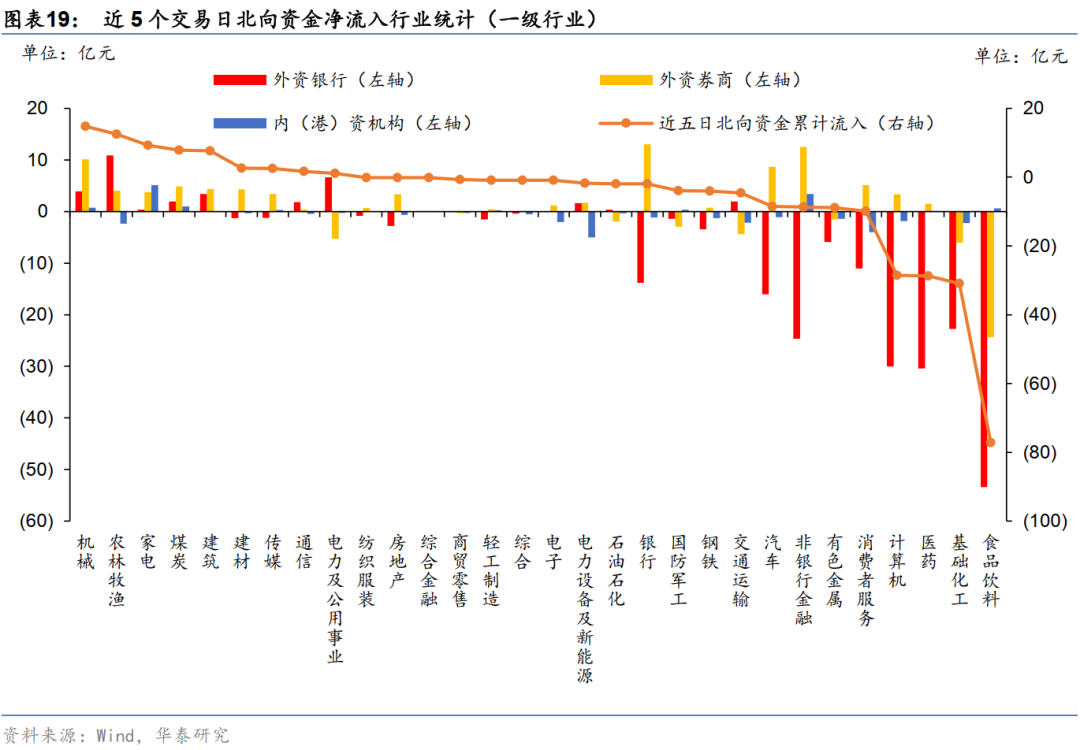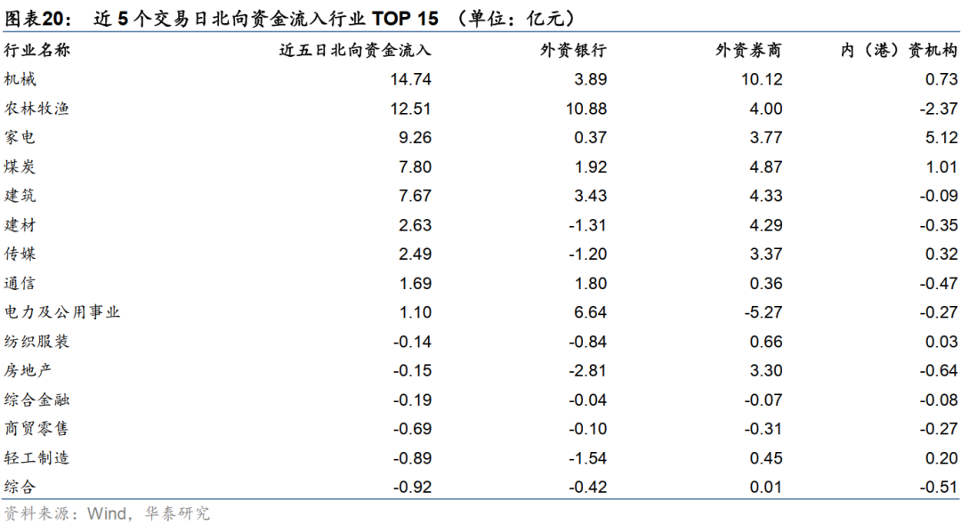具体统计来看托管于外资银行的资金总计净流入-188.39亿元,托管于外资券商的资金总计净流入40.37亿元,托管于内(港)资机构的资金总计净流入-15.81亿元。