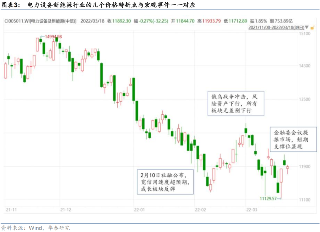 我们看到近期市场对于宏观数据反馈较为及时,风格的切换速度比较快:2月10日社融数据公布后宽信用预期升温,成长股出现反弹;随后俄乌战争爆发导致全球风险资产下行,外资加速流出叠加疫情扩散导致A股各版块普跌,成长板块行情也随之中断:直至上周三金融委会议提振市场信心,成长板块和价值板块先后反弹。从电新板块的K线图上可以鲜明看到上述三个时间点位对A股的影响。