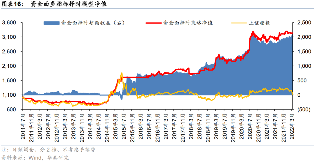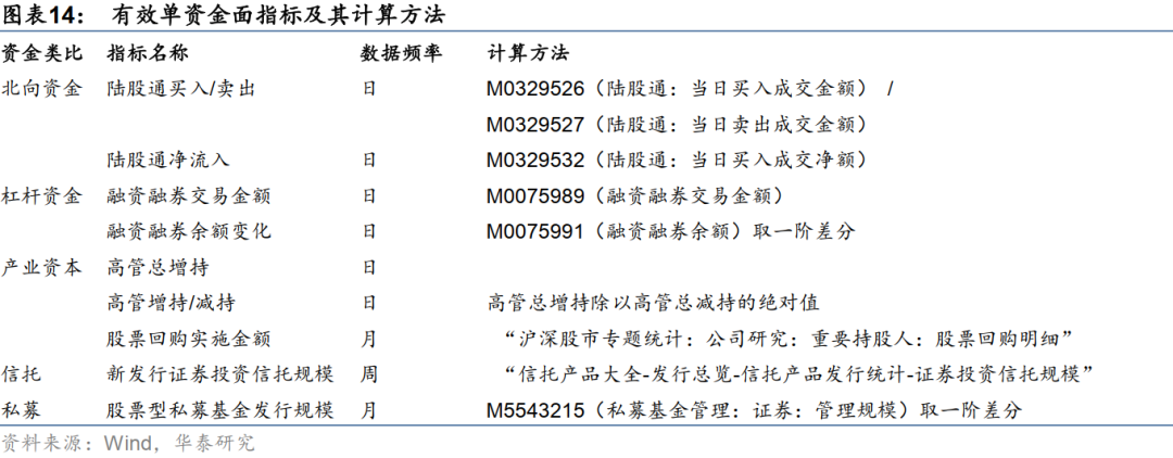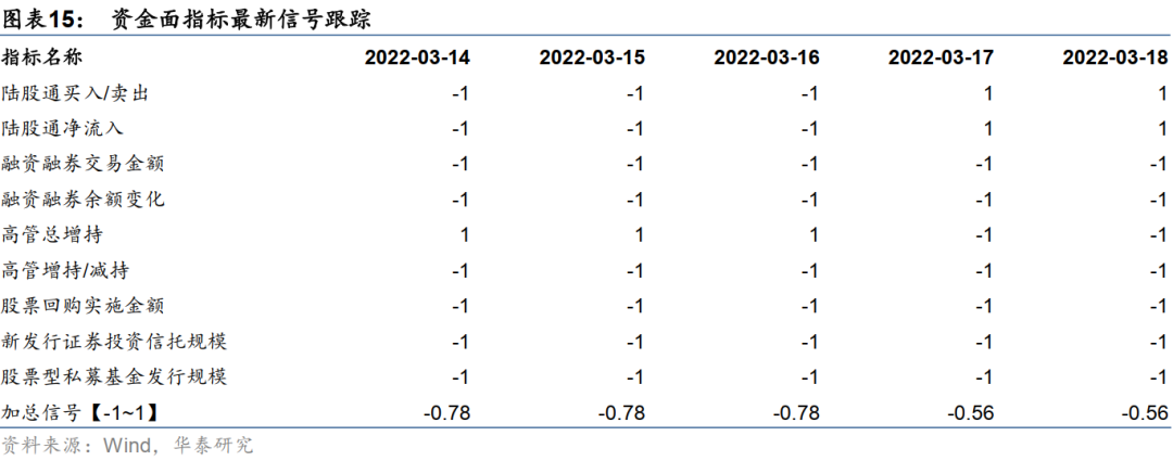 在华泰金工择时系列报告《A股择时之资金面指标测试》(2021-07-02)中,我们将参与A股投资的资金分为产业资本和金融资本,又将金融资本细分为境外机构投资者(北向资金)、境内机构投资者(公募基金、信托、私募、券商资管、保险)、境内个人投资者、杠杆资金等大类;在各资金类型中遴选和构建代表性指标,并采用统一的择时框架进行测试。以上证指数及其同期的最佳择时策略为参照,从北向资金、杠杆资金、产业资本、信托、私募类资金中筛选出9个有效的择时指标如下,并基于单指标测试结果构建多指标择时策略。根据2022年3月19日最新建模结果,陆股通买入/卖出、陆股通资金净流入发出看多信号,融资融券交易金额、融资融券余额变化、高管总增持、高管增持/减持、股票回购实施金额、股票私募基金管理规模变化、新发行证券投资信托产品发行规模发出看空信号,在[-1~1]区间中,加总信号得分为-0.56。
