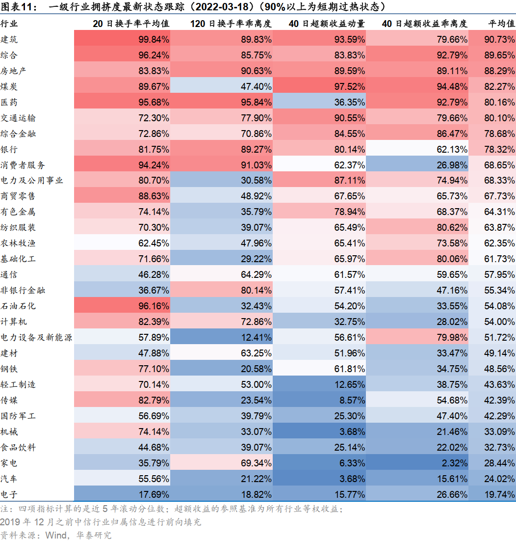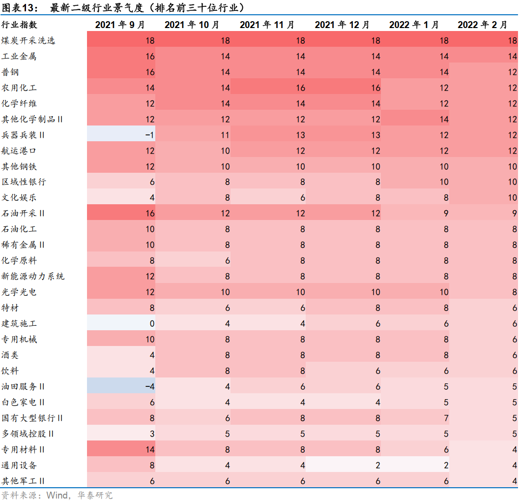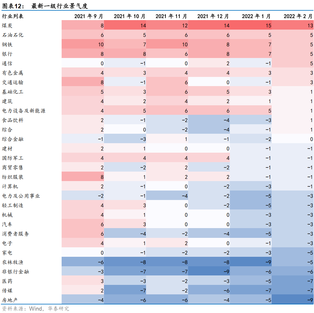 根据2022年2月28日的最新建模结果,全市场景气度大于零一级行业个数为12个,景气度向上的行业数目在三分之一左右,市场整体处于景气度下行区间。景气度打分排名前五的一级行业分别是:煤炭、石油石化、钢铁、银行、通信。景气度打分排名前十的二级行业分别是煤炭开采洗选、工业金属、普钢、农用化工、化学纤维、其他化学制品Ⅱ、兵器兵装Ⅱ、航运港口、其他钢铁、区域性银行。