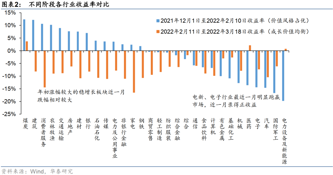 我们看到近期市场风格出现切换现象,去年12月至今年2月上旬以周期和大金融为代表的价值方向表现较好,2月中下旬随着社融数据公布后宽信用预期升温,成长股和价值股在市场表现上总体均衡。我们认为2月下旬成长股的反弹行情受到了俄乌战争以及疫情扩散等事件影响,在外部冲击逐渐缓解之后,市场将重回对于国内经济基本面以及流动性情况的关注。而且随着宽货币向宽信用传导的宏观环境逐渐明朗,我们看到成长板块的机会逐渐增大,投资策略上我们建议从价值风格逐渐切换到成长风格。