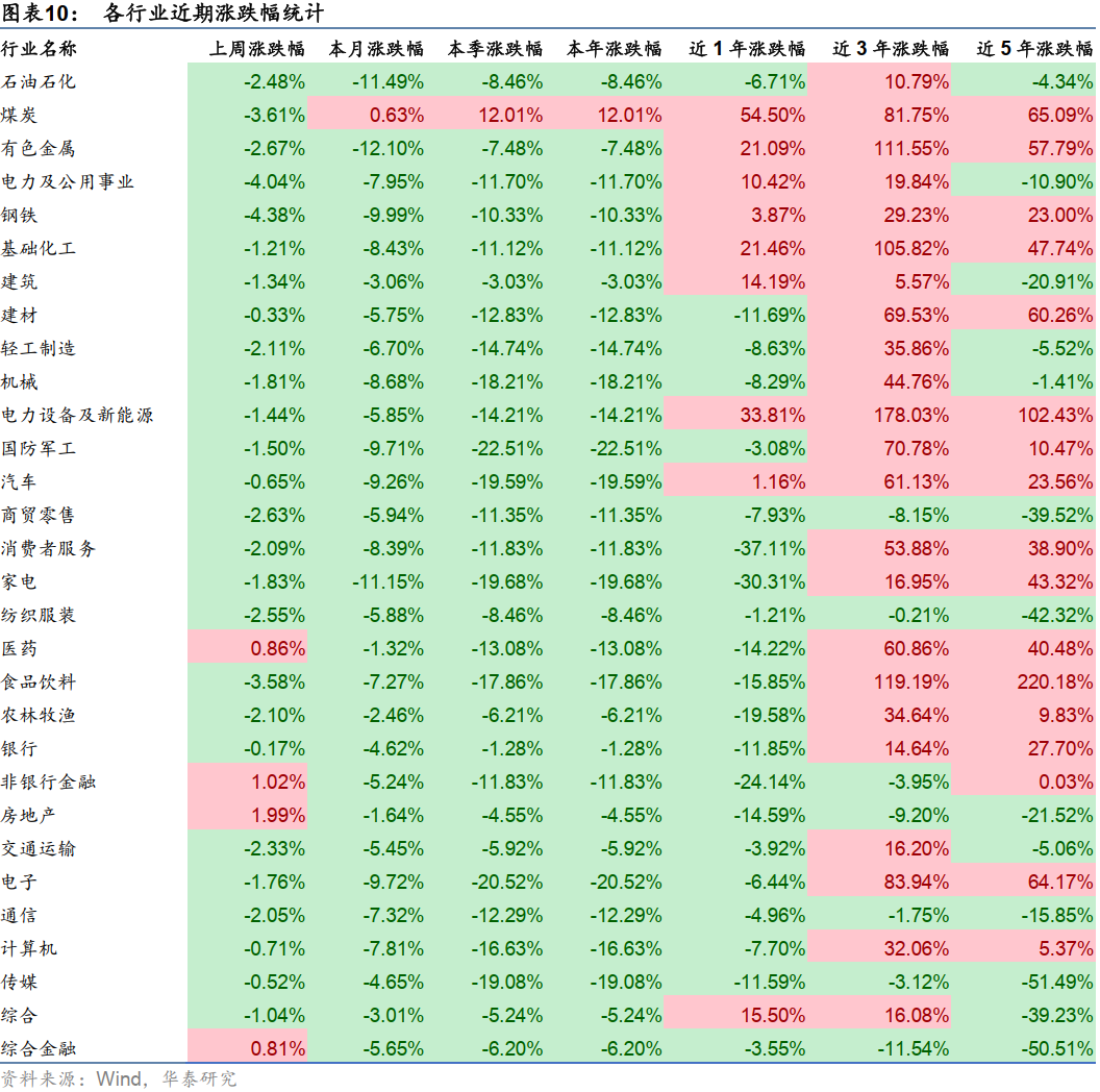 上周周一到周三股市出现较大程度下行,周三金融委会议后市场情绪提振,股市强势反弹,较多板块出现放量上涨状态。整体来看各行业涨跌幅相差不大,成长股和价值股都出现明显反弹,医药、非银行金融、房地产、综合金融行业录得正收益,钢铁、煤炭、电力及公用事业、食品饮料行业相对跌幅靠前。股市整体拥挤度不高,建筑、综合与房地产行业短期处于交易过热状态,消费和成长板块的交易热度仍处于低位。