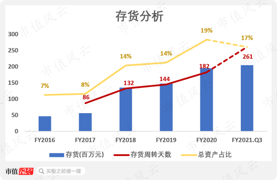 但别忘了,从2020年开始,公司的营收是在下降的,因此,在营收下降的同时加大备货,继续增加库存压力,就是业务模式再不同也不合理吧?