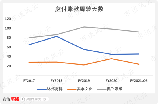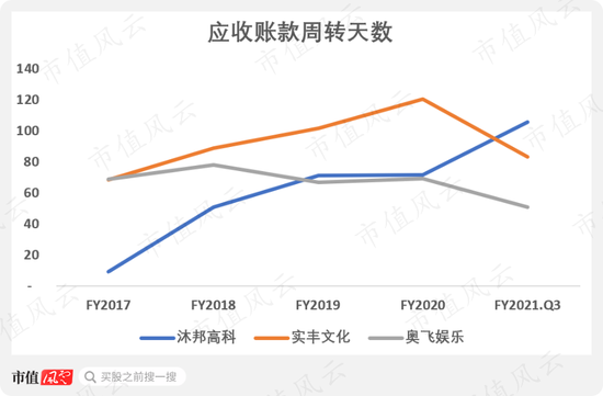其中,应收账款周转天数从2017年的10天左右,上升到了2021年三季度的106天。而这期间,同行业的奥飞娱乐却呈下降趋势。