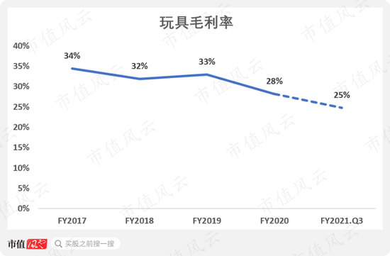 首先是玩具业务的毛利率,从2017年的34%一路下降到2021年三季报的25%。