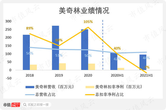 不过虽然这美奇林的业务能力不咋地,但自从2018年并表以来,对沐邦高科的业绩拉动确实不小,营收贡献度都在50%左右,2020年扣非净利润贡献度更是高达105%。