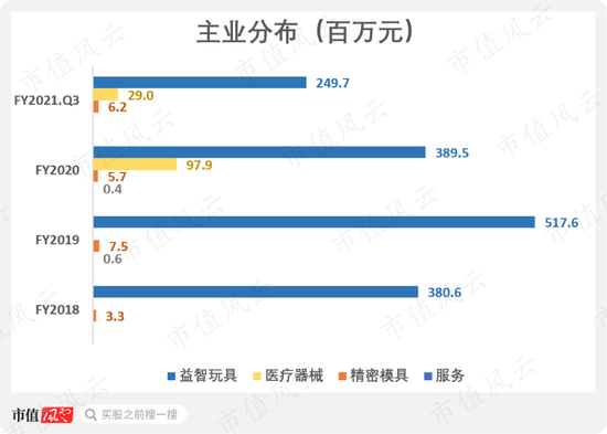2015年上市的沐邦高科,主业为玩具制造,虽然目前已经扩展到医疗、精密制造等,但近几年玩具制造的收入占比依然在80%以上。