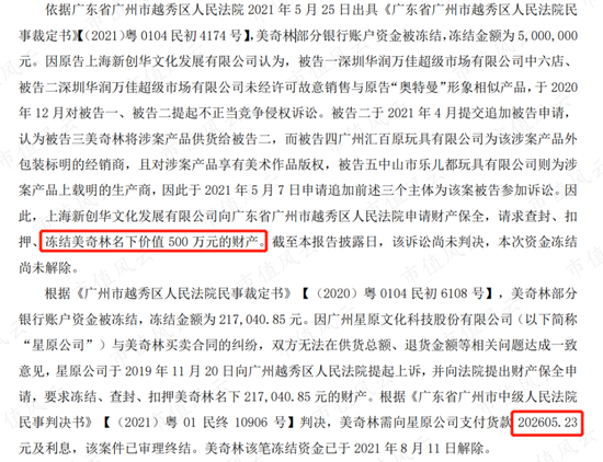 更不让人省心的是,2021年,美奇林还因涉及两场诉讼被冻结资金500万元,赔偿现金20多万元。