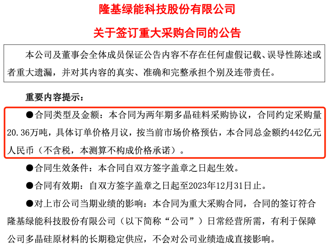 3月21日盘后,隆基股份披露了一则“关于签订重大采购合同的公告”,该合同是与通威股份签订的为期2年多的多晶硅采购协议,合同约定采购总量高达20.36万吨,按照当前市场价格预估,合同金额高达442亿元。