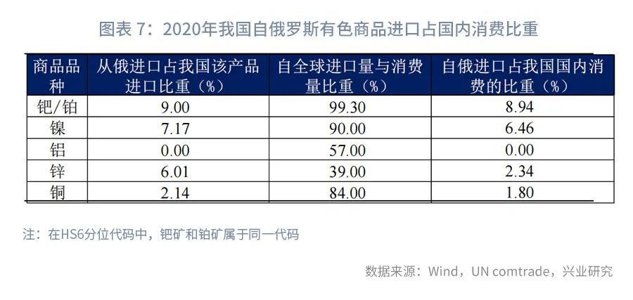 同时,俄罗斯也是全球主要有色矿产资源国,产量占全球比重位居前位的主要有:钯矿、锑矿、钒矿、铂矿等。结合我国消费进口依赖度看,我国自俄罗斯进口占我国消费比重较高的产品有钯矿、铂矿和镍矿。
