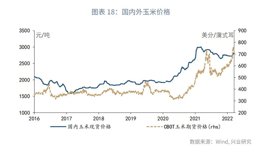 从玉米来看,2021年玉米进口占国内消费量的9.4%,因此,国内外玉米价格之间有一定的正向关联。不过,开年以来国内玉米价格的上涨幅度远不及国际玉米价格。这是因为我国的玉米主要用于制作饲料,而目前国内生猪、白羽肉鸡都存在一定的供给过剩,需要去化产能,因而平抑了玉米价格的波动。由于生猪供应总体过剩,玉米价格稳中有涨将增加饲料成本压力,加快生猪去产能的步伐。此外,由于2021年食用玉米在我国全部玉米消费中的占比仅3.1%,玉米价格对粮食价格没有显著的影响,其对CPI的影响主要体现在猪肉价格之中。