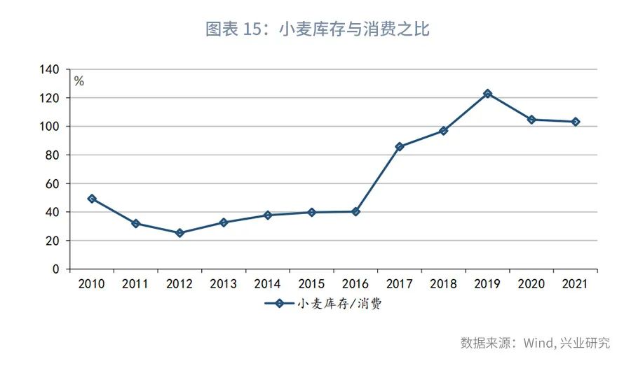 从小麦来看,我国小麦市场呈现出进口依赖度低,且库存高的特点。2021年我国小麦进口量占总消费量的比例为5.9%,进口依赖度不高,且小麦库存与消费之比为103.2%。