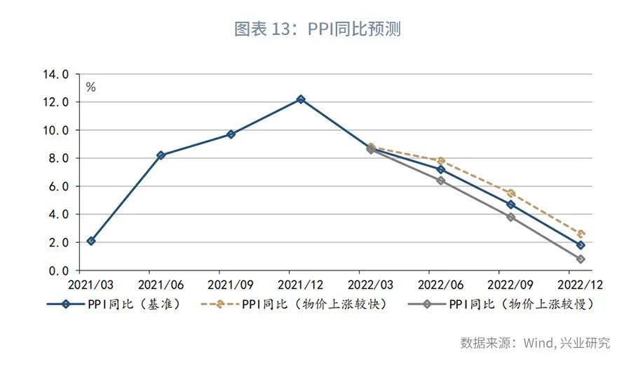 根据上述分析,在基准情境下,2022年全年PPI同比中枢可能达到5.6%左右,较2021年下降2.5个百分点。