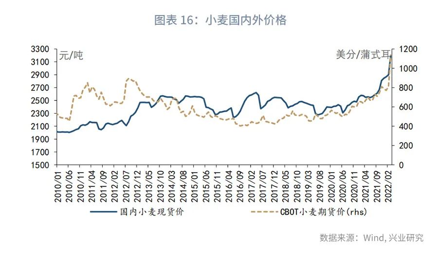 在基准情境下,即使俄乌达成停火协议,供应链中断、参军等依然会导致春季播种面积下降,且可能影响到去年冬季播种的冬粮的收获,因此,我们假设在6月我国冬小麦上市前小麦价格维持高位,6月起小麦价格开始回落。