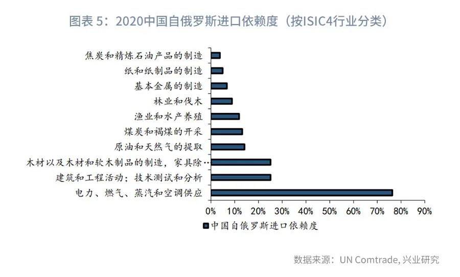 对我国而言,我国是俄罗斯第一大出口目的地,2020年俄罗斯对我国出口占其出口总值的比重为14.6%。我国自俄罗斯进口依赖度最高的为电力、燃气、蒸汽和空调供应行业,占我国进口总值的76.2%;随后依次为建筑和工程活动(25.0%)、木材以及木材和软木制品的制造(25.0%)、原油和天然气的提取(14.1%)、煤炭和褐煤的开采(13.2%)等。