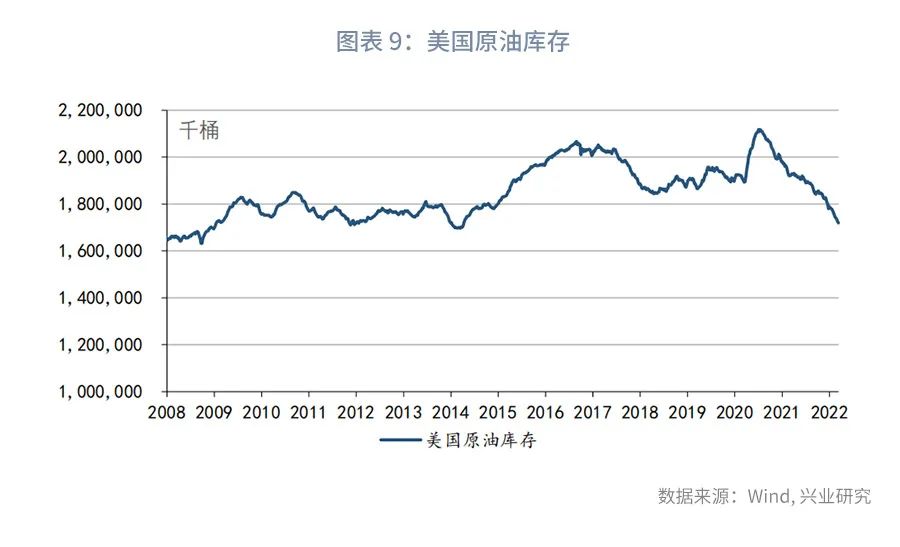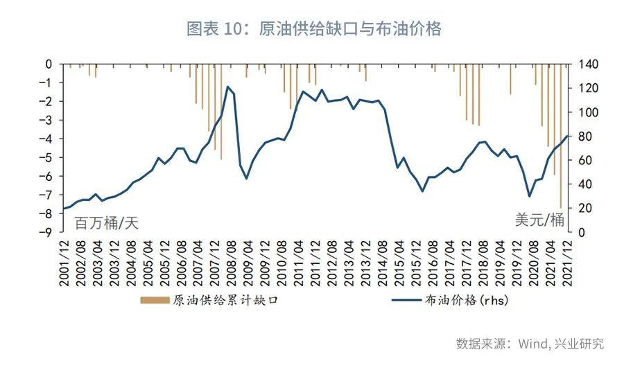 历史经验表明,当原油供给累计缺口拐头之后,布油价格的高点才会出现。这意味着,只要未来原油延续供不应求的局面,油价中枢就有抬升的风险。历史数据显示,2012年页岩油革命以来,原油的库销比与油价负相关。在基准情境下,我们假设第二季度原油供给累计缺口进一步扩大,原油库存的底部在第二季度出现,但年内原油库存依然处于低位。在此情境下,第二、第三和第四季度的油价可能分别在每桶110美元、105美元和100美元左右。