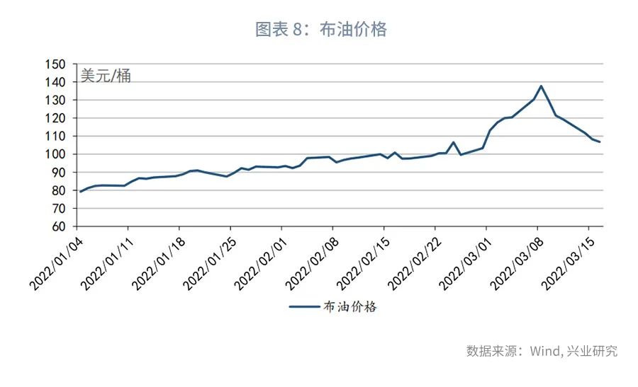 上文中提到,我国对乌克兰葵花籽油、小麦和玉米的进口依赖度较高。但葵花籽油在我国食用植物油消费中的占比仅为4%[6]虽然俄乌冲突后葵花籽油乃至其他食用油价格有所上涨,但根据我们的估计,食用油在我国CPI篮子中的占比不到1%,因此,食用油价格上涨对我国CPI的影响相对有限。