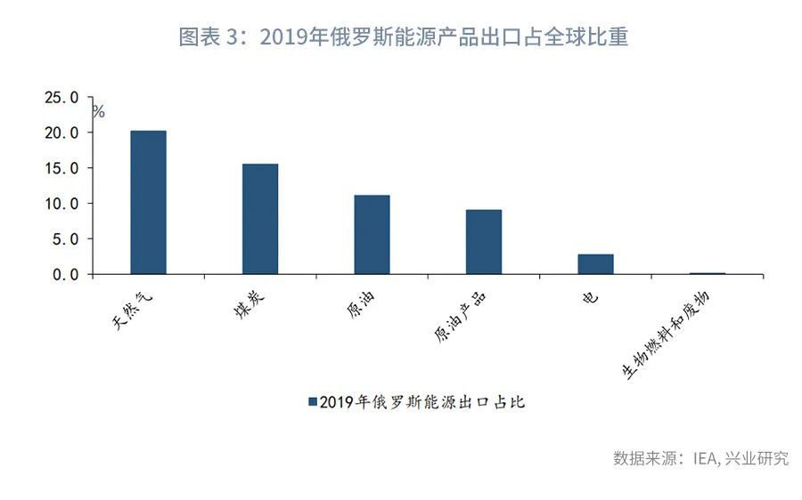 从俄罗斯出口看,2020年俄罗斯出口总值为3322.3亿美元,占全球出口总值比重为1.9%,但俄罗斯油气与谷物出口在全球出口中的占比较高。俄罗斯是全球第一大天然气出口国和第二大原油出口国。2019年俄罗斯天然气出口占全球出口比重为20.2%,煤炭出口占全球比重为15.5%,原油出口占全球比重为11.1%;同时,俄罗斯是主要小麦出口国,2020年俄罗斯谷物出口占全球比重为7.5%,植物油出口占全球比重为4.3%。